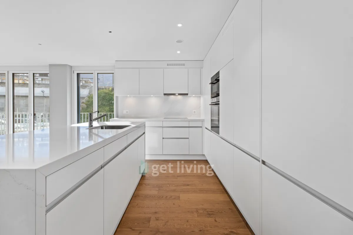 The apartment is located on the ground floor of a six-story building and offers an unobstructed view of the surroundings and Mount Rigi. High-quality materials, clear architecture, and modern fittings create a stylish living atmosphere.