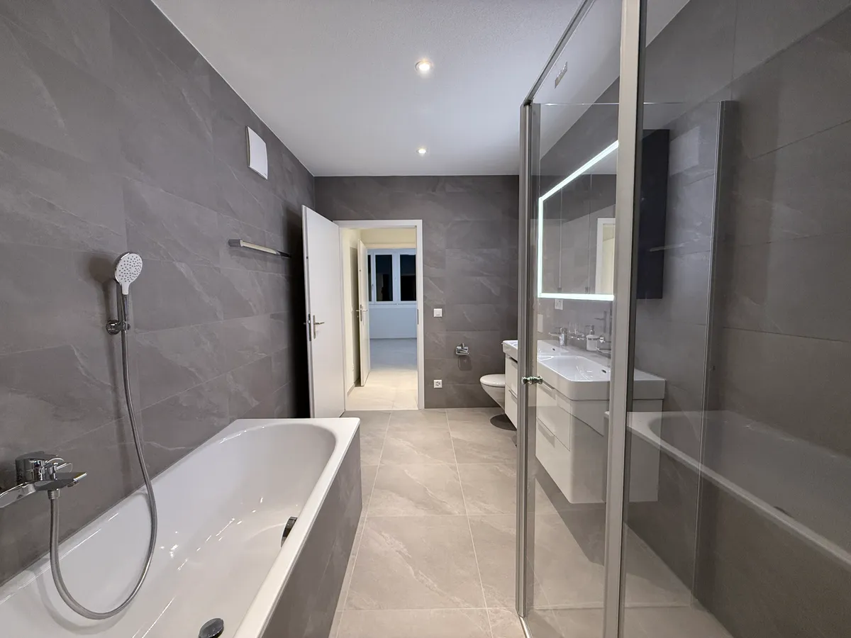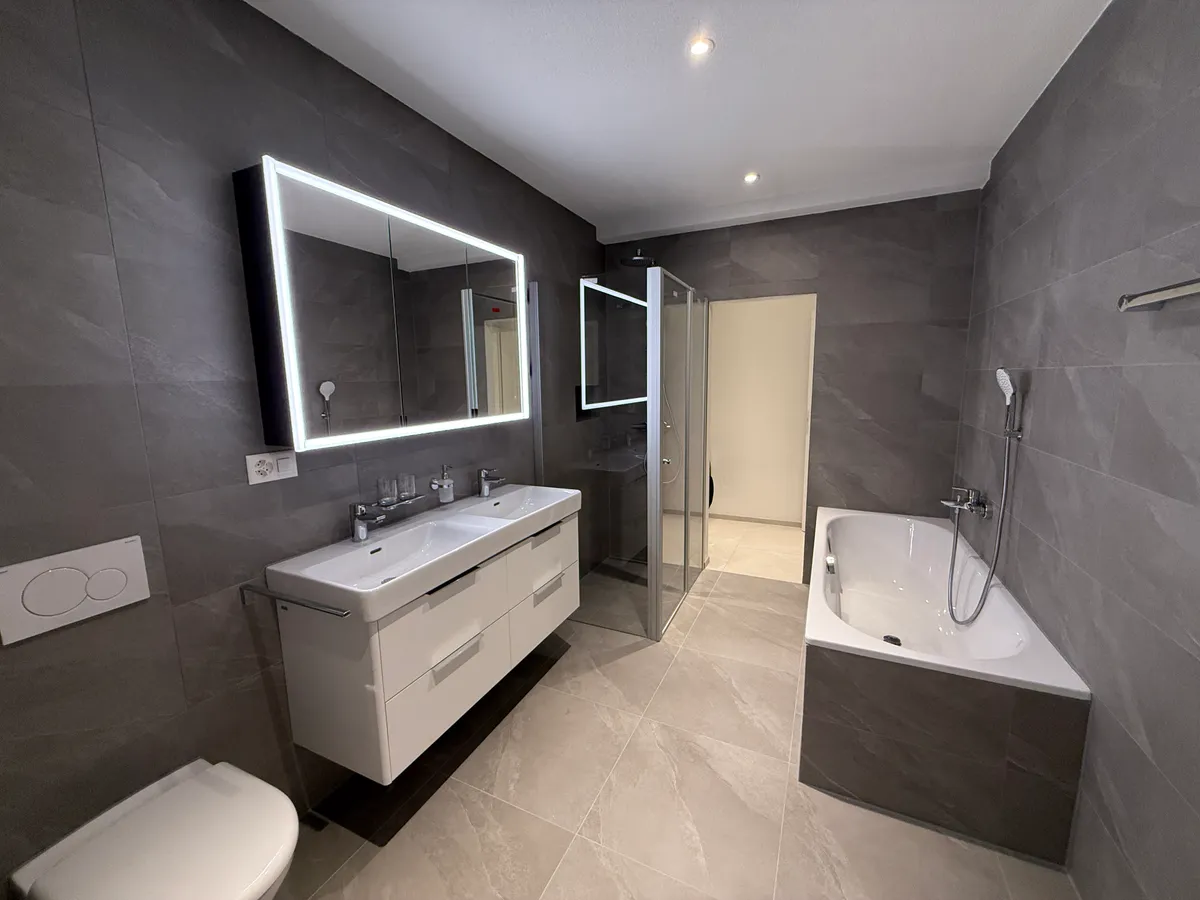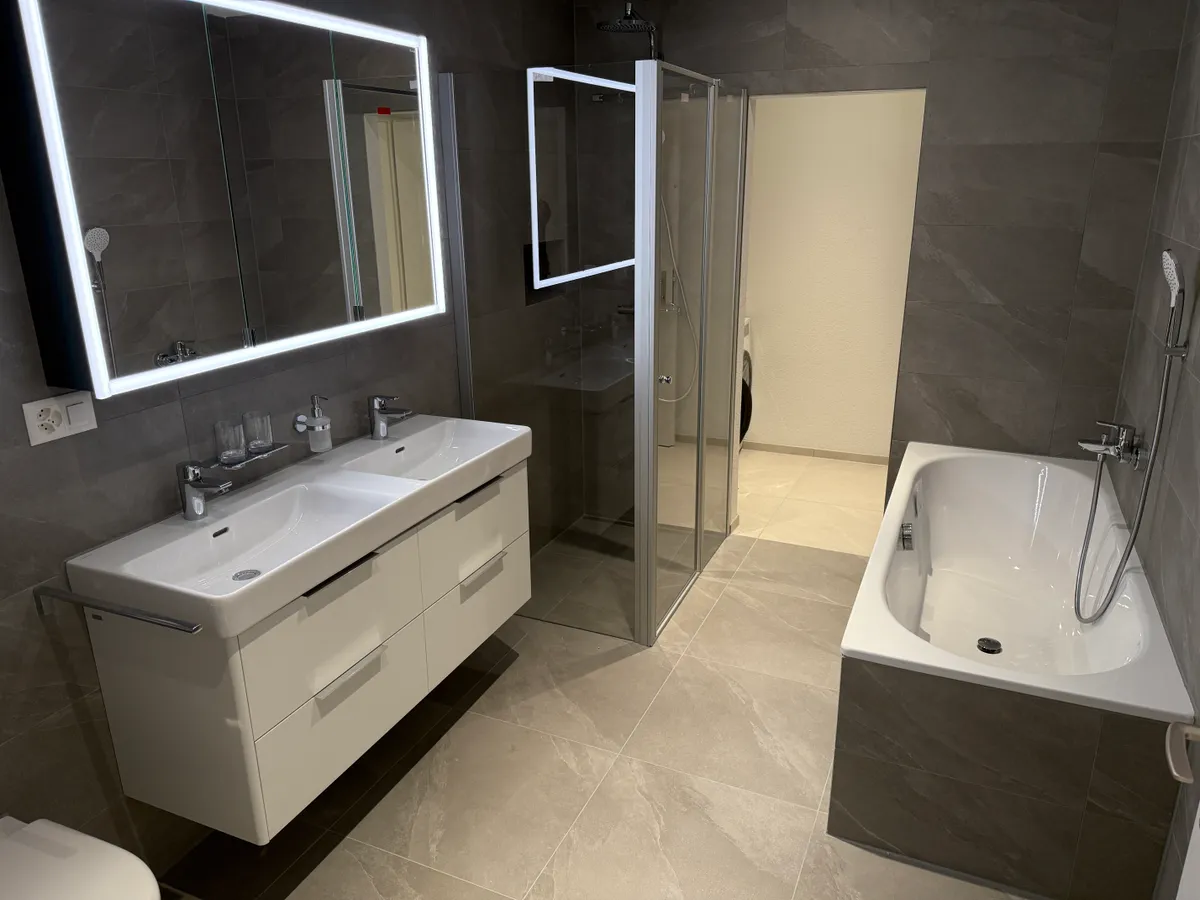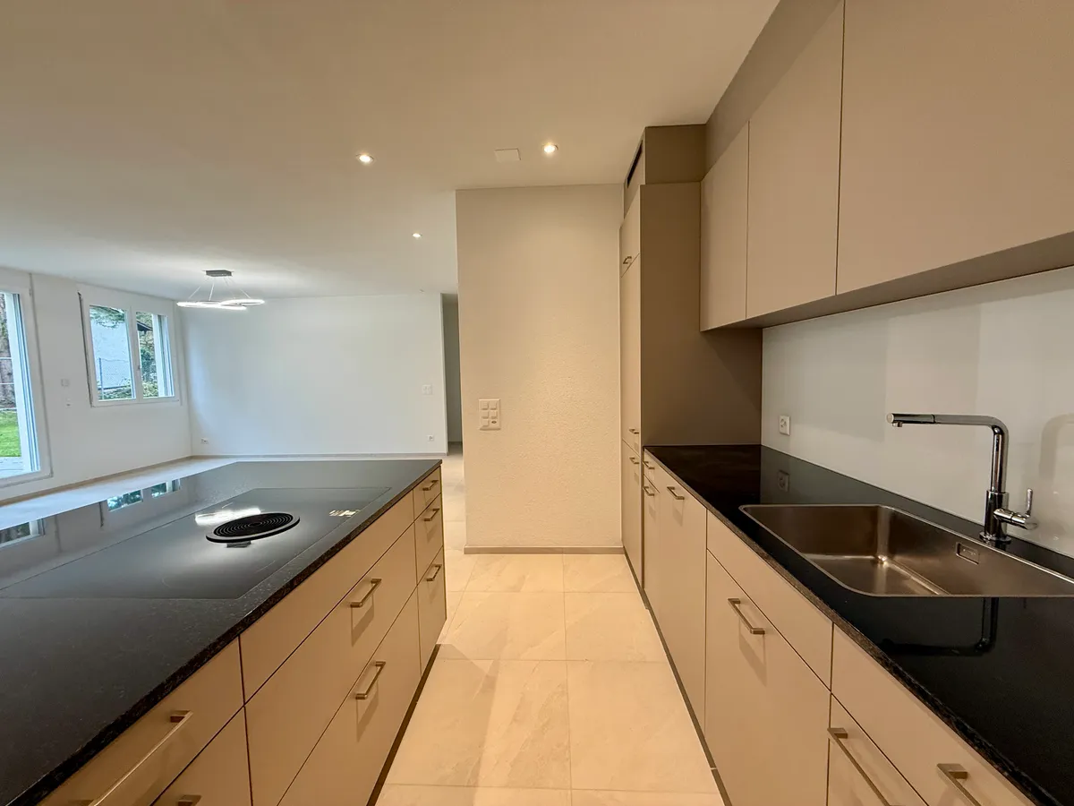 Hochwertiger Ausbaustandard mit Familienbad (Dusche/Badewanne/Toilette/Lavabo) und Gästebad (Dusche/Toilette/Lavabo) / integriertes Reduit mit eigenem Waschturm / Küche mit Kochinseln und BORA Abzug