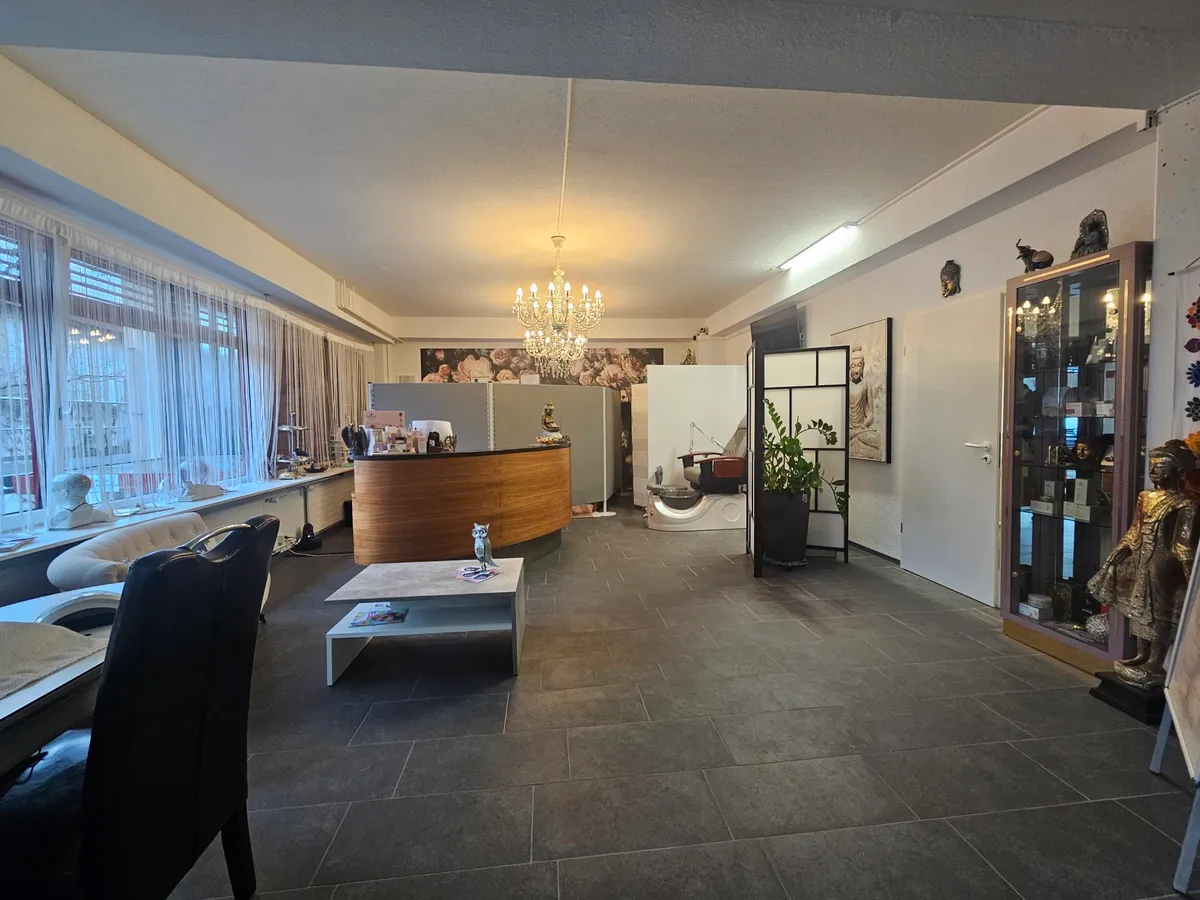 Dieses attraktive Ladenlokal überzeugt durch seine moderne Gestaltung, grosszügige Raumwirkung und vielseitige Nutzungsmöglichkeiten. Der helle Hauptraum bietet dank grosser Fensterfront eine freundliche, einladende Atmosphäre und eignet sich ideal für Dienstleistungs-, Beauty-, Beratungs- oder Verkaufsnutzungen. Die stilvolle Einrichtung mit edlen Bodenplatten, dekorativer Beleuchtung und elegantem Empfangsbereich schafft sofort einen hochwertigen Eindruck bei Kundschaft und Besuchern.