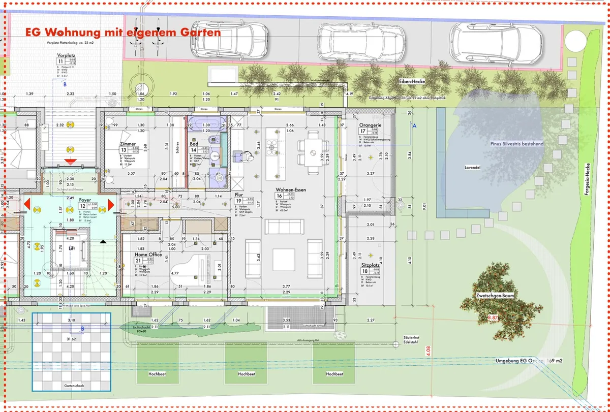 Im Erdgeschoss erwerben Sie eine lichtdurchflutete 3.5 Zimmer-Gartenwohnung (95 m2) mit grosszügigem eigenem Garten (169m2). Ob Quooker, Einbauschränke, offene Küche oder eigene Waschmaschine/Tumbler und Solaranlage – diese Immobilie verfügt über alle Attribute einer nachhaltigen Ausstattung im Solarzeitalter. Im Souterrain können Sie optional ein hochwertig und komfortabel ausgestattetes Studio (54 m2) mit Bodenheizung, Teeküche, Sanitäreinheit und separatem Zugang dazukaufen für rund 225`000.-. Die Kombination von 3.5-Zimmer-Wohnung mit Wintergarten und Studio eröffnet vielfältige Nutzungs- und Freizeitmöglichkeiten für gesundes Wohnen mit separatem Fitness-, Hobby- oder Rückzugsraum (Home Office).
